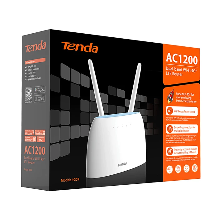 مودم روتر بی سیم تندا مدل 4G09 با پشتیبانی از شبکه LTE (3G,4G,4G+) بهترین عملکرد جهت برخوردار شدن از شبکه اینترنت سیم کارتی را برای کاربران خود فراهم می آورد. و گزینه ایده آلی برای فروشگاه و خانه می باشد، مودم سیم کارت خور امکان دسترسی به اینترنت در هر کجا و هر زمان را به کاربران خود می دهد. این دستگاه با استفاده از فناوری قدرتمند AC1200 ، سرعت بی سیم تا 1200 مگابیت بر ثانیه را فراهم می کند. که دستگاه های متصل را قادر به دستیابی به سرعت فوق العاده سریع می کند ، این گزینه ایده آل برای تماشای فیلم با کیفیت HD و بازی آنلاین و موارد دیگر است.